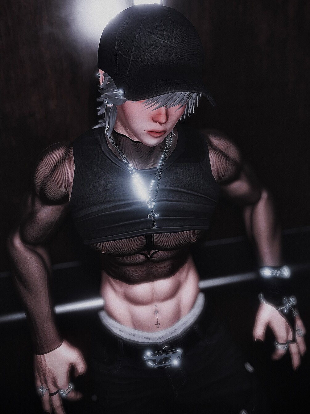 ✮ Acces : Rave glasses, Big glasses, Face piercings, Rings, Bracelets, Belly piercing, Glove, Necklace cross, Necklace 2, Belt